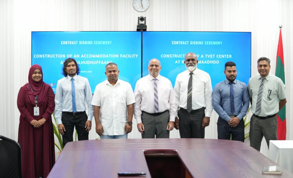 އިންނަމާދޫގައި ޓެކްނިކަލް ވޮކޭޝަނަލް އެޑިޔުކޭޝަން އެންޑް ޓްރެއިނިންގ (ޓިވެޓް) ސެންޓަރެއް ބިނާކުރުމާއި، ހުޅުދުއްފާރުގައި އެކަމަޑޭޝަން ފެސިލިޓީއެއް ގާއިމުކުރުމުގެ އެއްބަސްވުމުގައި ސޮއިކުރުން. ފޮޓޯ: ހަޔަރ އެޑިއުކޭޝަން މިނިސްޓްރީ