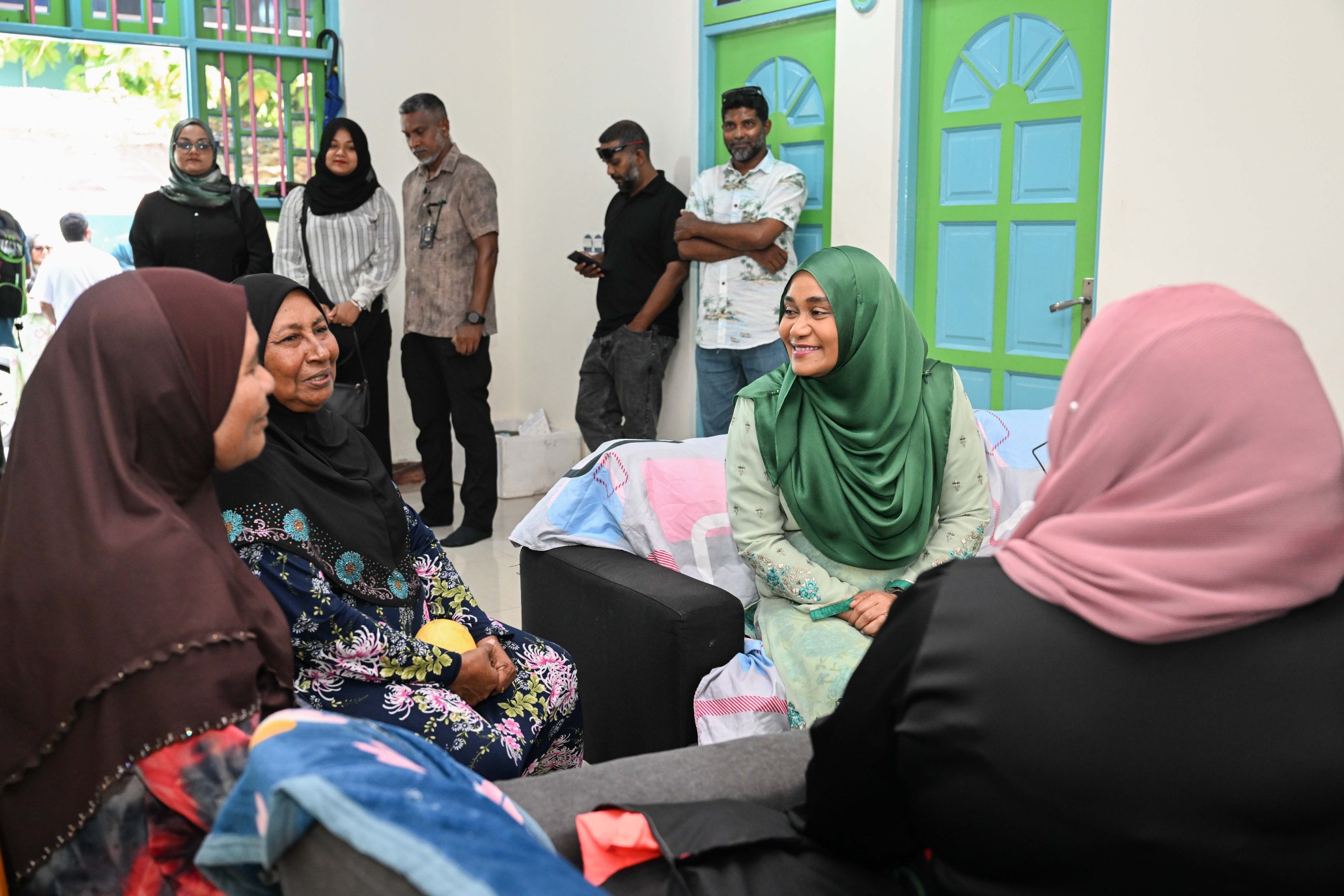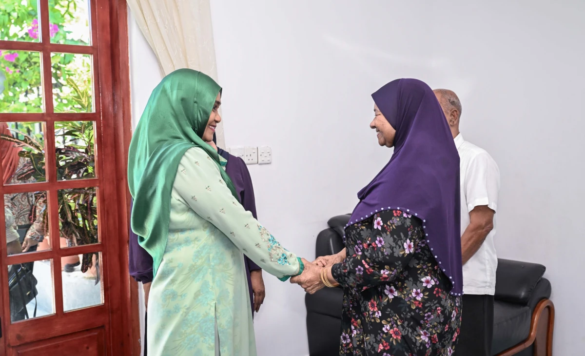 ފުވައްމުލަކު ދޮރުން ދޮރަށް ހަރަކާތުގައި ފަސްޓް ލޭޑީއާ އާއިލާއަކާ ބައްދަލުކުރައްވަނީ. ފޮޓޯ: ޕީއެންސީ