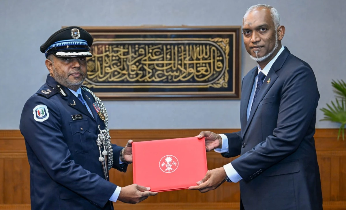 ރައީސުލްޖުމްހޫރިއްޔާ ޑރ. މުޙައްމަދު މުއިއްޒު، ކޮމިޝަނަރ އޮފް ޕޮލިސްގެ މަގާމަށް އަޙްމަދު މުޙައްމަދު (ޓޫފޯ) އައްޔަނުކުރައްވައި މަގާމުގެ ފަތްކޮޅު އަރުވާފައި ވަނީ މިއަދު ރައީސުލްޖުމްހޫރިއްޔާގެ އޮފީހުގައި ބޭއްވި ރަސްމިއްޔާތުގަ އެވެ.