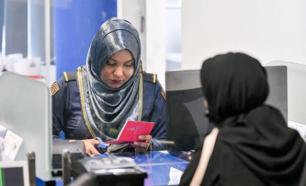 އިމިގްރޭޝަނުގެ އޮފިސަރަކު ދިވެހި ޕާސްޕޯޓެއް ދޫކުރަނީ. --ފޮޓޯ: މޯލްޑިވްސް ޖާނަލް