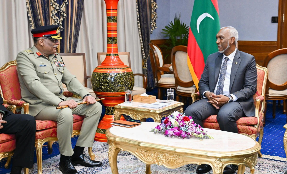 ޕާކިސްތާނުގެ ޖޮއިންޓް ޗީފްސް އޮފް ސްޓާފް ކޮމިޓީގެ ޗެއަރމަން، ޖެނެރަލް ސާޙިރް ޝަމްޝާދް މިރްޒާ، ރައީސުލްޖުމްހޫރިއްޔާ ޑޮކްޓަރ މުޙައްމަދު މުޢިއްޒުގެ އަރިހަށް އިޙުތިރާމުގެ ޒިޔާރަތެއް ކުރައްވައިފި. މިކަމަށްޓަކައި ރައީސުލްޖުމްހޫރިއްޔާގެ އޮފީހުގައި ބޭއްވެވި ބައްދަލުކުރެއްވުމުގައި ރައީސުލްޖުމްހޫރިއްޔާ ވަނީ، ޖެނެރަލް މިރްޒާއަށް ހޫނު މަރުޙަބާއެއް ވިދާޅުވެފަ. ދެ ބޭފުޅުންގެ މަޝްވަރާތައް ބިނާކުރައްވާފައިވަނީ، ދެ ޤައުމުގެ ޒަމާންވީ ގުޅުން އިތުރަށް ހަރުދަނާކުރުމާއި، ކުރިއަށް އޮތް ދުވަސްތަކުގައި ދެ ޤައުމުން ގުޅިގެން ކުރެވިދާނޭ މަސައްކަތްތަކުގެ މައްޗަށް.