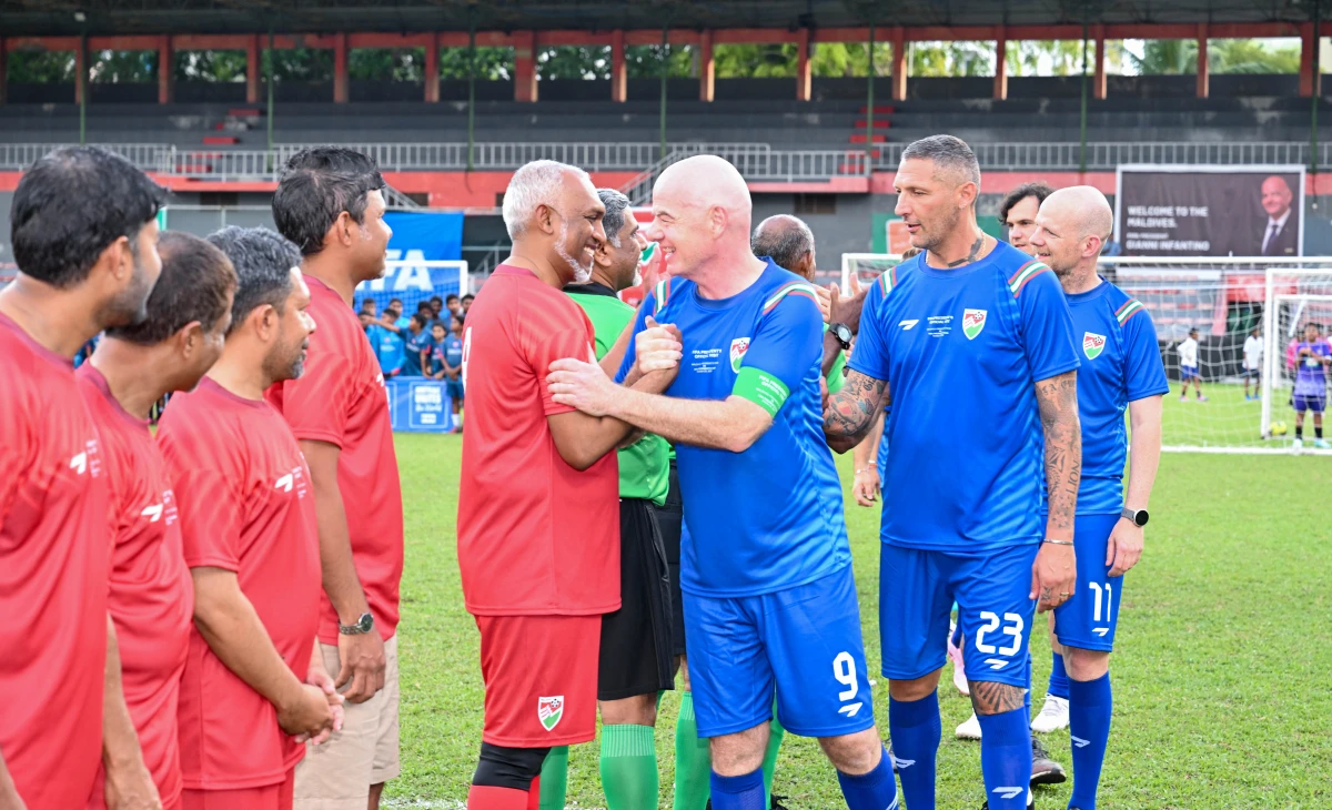 ފުޓްބޯލް އެސޯސިއޭޝަން އޮފް މޯލްޑިވްސް (އެފް.އޭ.އެމް) ކިޑްސް ފުޓްބޯލް ފެސްޓިވަލްގައި ބޭއްވި ޚާއްޞަ އެގްޒިބިޝަން މެޗެއްގައި ރައީސުލްޖުމްހޫރިއްޔާ ޑޮކްޓަރ މުޙައްމަދު މުޢިއްޒު އާއި، އިންޓަރނޭޝަނަލް ފެޑެރޭޝަން އޮފް އެސޯސިއޭޝަން ފުޓްބޯލް (ފީފާ) ގެ ރައީސް ޖިއަނީ އިންފަންޓީނޯ ބައިވެރިވެވަޑައިގެންފި. މިއީ ފީފާގެ ރައީސް އިންފަންޓީނޯ ދިވެހިރާއްޖެއަށް ކުރައްވަމުންގެންދަވާ ޒިޔާރަތާ ގުޅިގެން އިންތިޒާމުކުރި ފުޓުބޯޅަ މެޗެއް. މި މެޗުގައި ރައީސުލްޖުމްހޫރިއްޔާގެ ޓީމުގައި، ރައީސުލްޖުމްހޫރިއްޔާގެ ނައިބު އަލްއުސްތާޛު ޙުސައިން މުޙައްމަދު ލަޠީފާއި، ބައެއް ވަޒީރުންނާއި ސަރުކާރުގެ އިސް މަޤާމުތަކުގައި ތިއްބެވި ބޭފުޅުންވެސް ހިމެނިވަޑައިގަތް. އަދި ފީފާގެ ރައީސްގެ ޓީމުގައި އިޓަލީގެ ކުރީގެ ފުޓުބޯޅަ ކުޅުންތެރިޔާ މާކޯ މަޓަރާޒީގެ އިތުރުން، ދިވެހި ފުޓުބޯޅައިގެ ތާރީޚުގައި ނަންވިދާލި ގިނަ ޢަދަދެއްގެ ކުޅުންތެރިން ހިމެނިވަޑައިގަތް. މި މެޗު 6-4 ގެ ނަތީޖާއަކުން ކާމިޔާބުކޮށްފައިވަނީ، ފީފާގެ ރައީސް އިންފަންޓީނޯގެ ޓީމުން. މިއަދުގެ މެޗު ފެށުމުގެ ކުރިން، ރައީސުލްޖުމްހޫރިއްޔާ އާއި ފީފާގެ ރައީސް ވަނީ، ދިވެހި ފުޓުބޯޅައިގެ ޑައިމަންޑް ޖުބިލީ ލޯގޯ އިފުތިތާޙުކޮށްދެއްވާފަ. އަދި ރައީސުލްޖުމްހޫރިއްޔާ އާއި ފީފާގެ ރައީސް އަދި މެޗުގައި ބައިވެރިވެވަޑައިގެންނެވި މަޝްހޫރު ކުޅުންތެރިން ވަނީ، ކިޑްސް ފުޓްބޯލް ފެސްޓިވަލްގައި ބައިވެރިވާ ޓީމްތަކުގެ ކުދިންނަށް އޮޓޯގްރާފް ދެއްވާފަ.