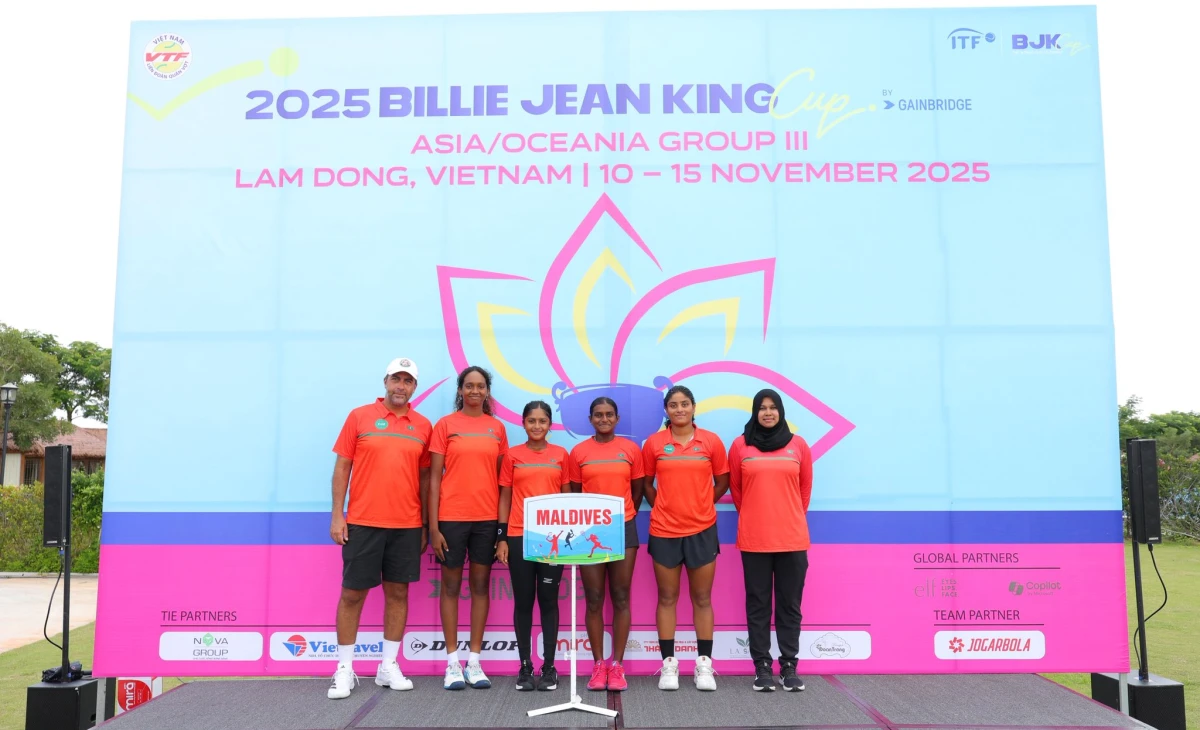 މުބާރާތުގައި ވާދަކުރާ ރާއްޖޭގެ އަންހެން ޓެނިސް ޓީމު، އޮފިޝަލުންނާއެކު. ފޮޓޯ: ޓީއޭއެމް