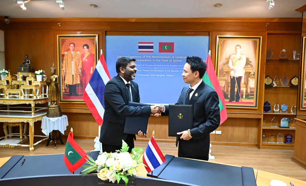 ކުޅިވަރުގެ ދާއިރާ އިން އެއްބާރުލުން ދިނުމާ ގުޅޭ ގޮތުން މެމޮރަންޑަމް އޮފް އަންޑަސްޓޭންޑިންގ (އެމްއޯޔޫ) އެއްގައި ރާއްޖޭގެ ކުޅިވަރާއި ހަށިހެޔޮކަމާ ބެހޭ ވަޒީރު ޢަބްދުﷲ ރާފިޢު އާއި ތައިލެންޑުގެ ފަތުރުވެރިކަމާއި ކުޅިވަރާ ބެހޭ ވަޒީރު އަޓްތަކޯން ސްރީލަޓްތަޔަކޯން ސޮއިކުރައްވައިފިއެވެ.