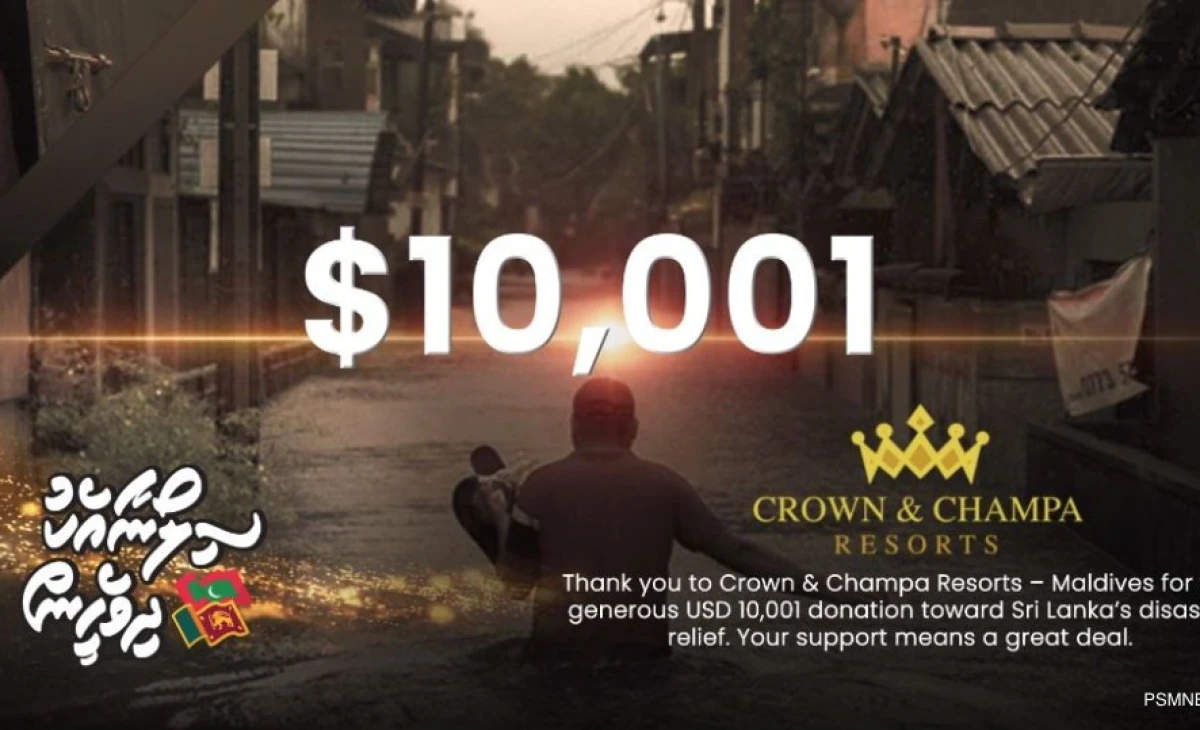 ސްރީލަންކާއަށް ކުރިމަތިވެފައިވާ މޫސުމީ ކާރިސާގައި އެގައުމުގެ ރައްޔިތުންނަށް އެހީތެރިކަން ފޯރުކޮށްދިނުމަށް ޕީއެސްއެމްއިން އިސްނަގައިގެން ރާއްޖޭގެ މީޑިޔާތަކާ ގުޅިގެން ކުރިއަށްގެންދާ ޓެލެތޯންއަށް ކްރައުން އެންޑް ޗަމްޕާ ރިސޯޓްސްއިން 10،001 ޑޮލަރު ހަދިޔާކޮށްފިއެވެ.