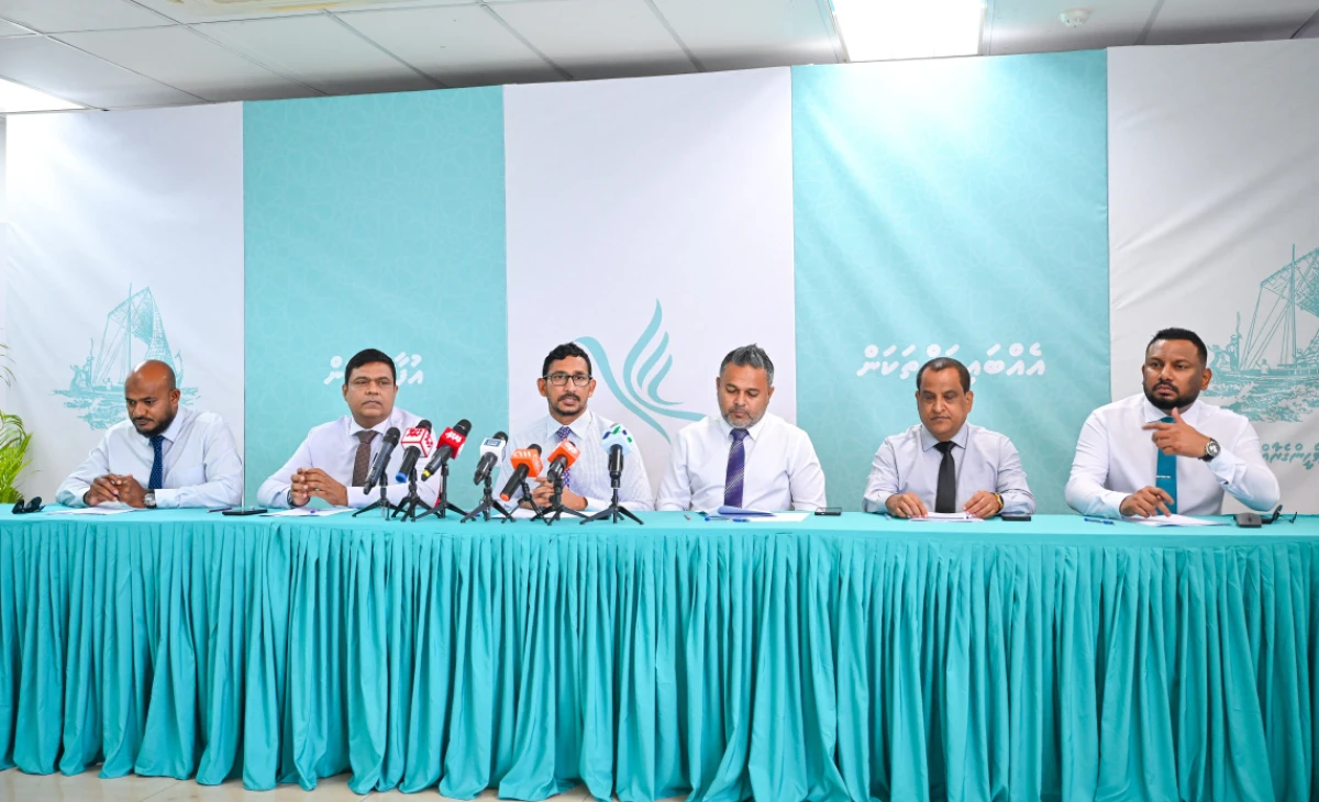 ލޯކަލް ކައުންސިލް އިންތިޚާބުގައި ޕީއެންސީގެ ޕްރައިމަރީގައި ވާދަކުރުމުގެ ފުރުސަތު ހުޅުވާލިކަން އިއުލާންކުރުމަށް ބޭއްވި ނޫސްވެރިންގެ ބައްދަލުވުމުގައި ޕާޓީގެ އިސް ބޭފުޅުން.-- ފޮޓޯ: މިހާރު