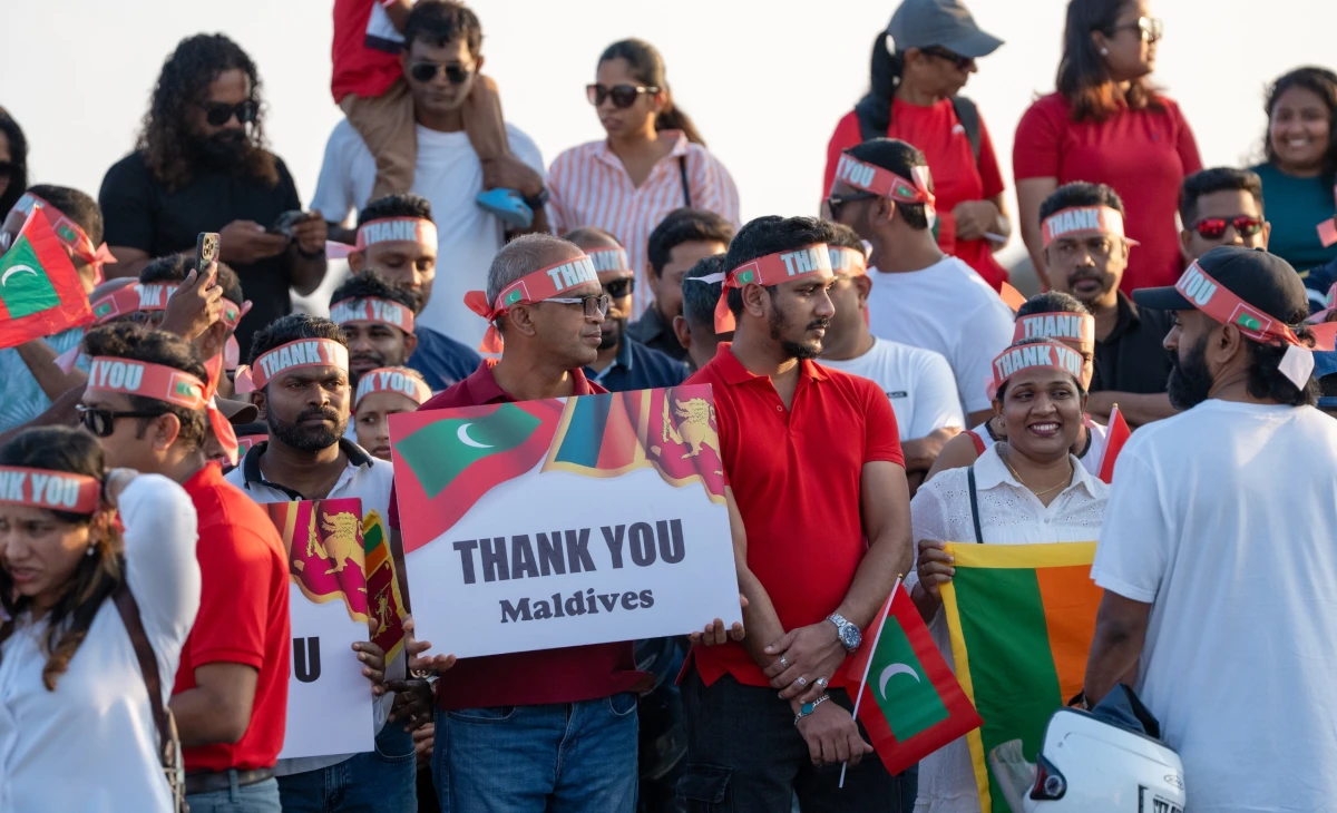 ދިވެހިން ލަންކާގެ ރައްޔިތުންނަށް ވެދިން އެހީތެރިކަން ފާހަގަކޮށް އެކަމަށް ޝުކުރު އަދާކުރުމުގެ ގޮތުން ބޭއްވި އެއްވުމުމުގެ ތެރެއިން. --ފޮޓޯ:އެމްއެމްޓީވީ