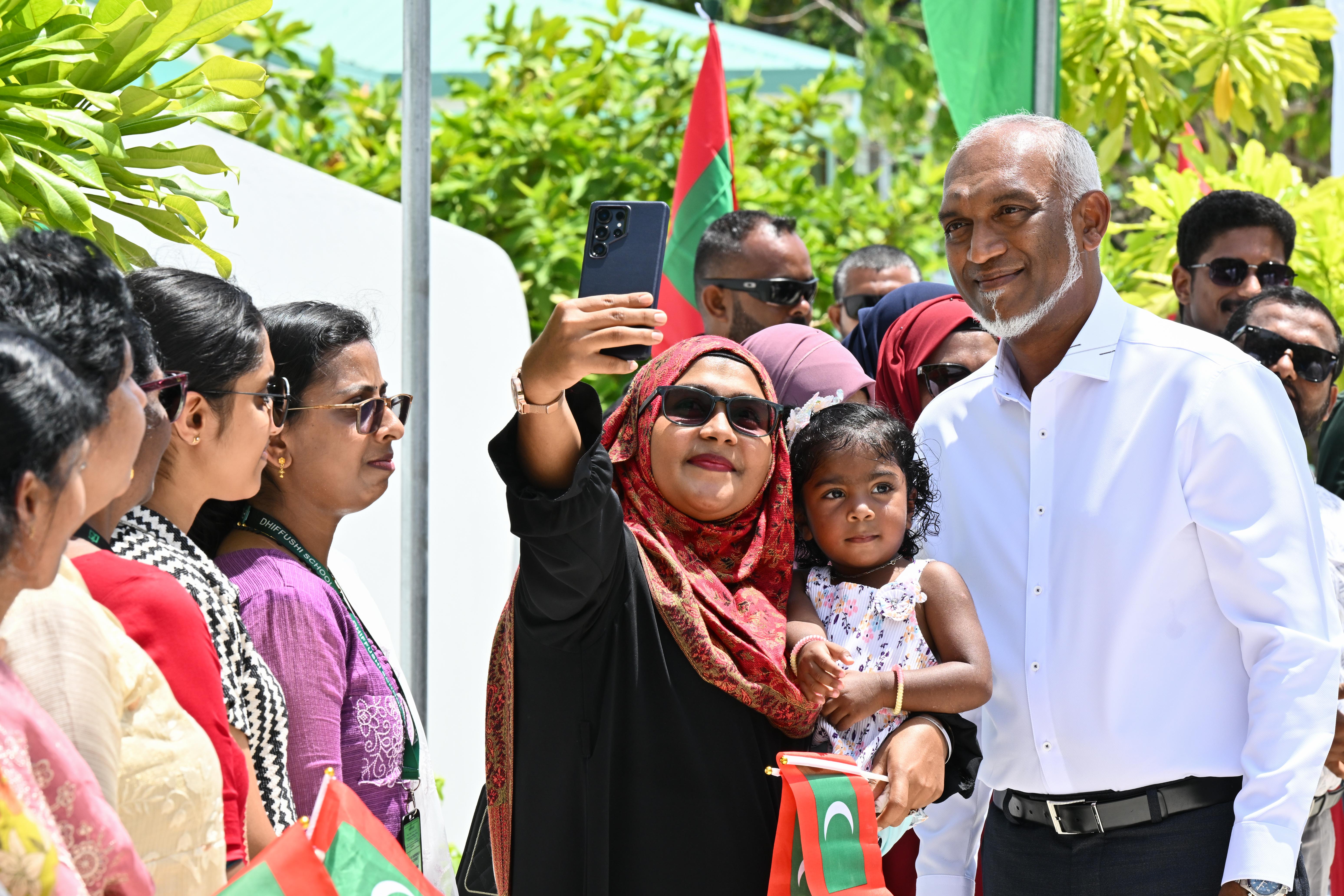 އައްޑޫ ސިޓީން ރައީސުލްޖުމްހޫރިއްޔާ ޑރ. މުޙައްމަދު މުޢިއްޒު އަށް މަރުޙަބާ ކިޔުން. އެމަނިކުފާނުގެ ސިޔާސަތުތަކަށް ގިނަ ބަޔަކު ތާއިދުކުރޭ. ފޮޓޯ: ރައީސް އޮފީސް