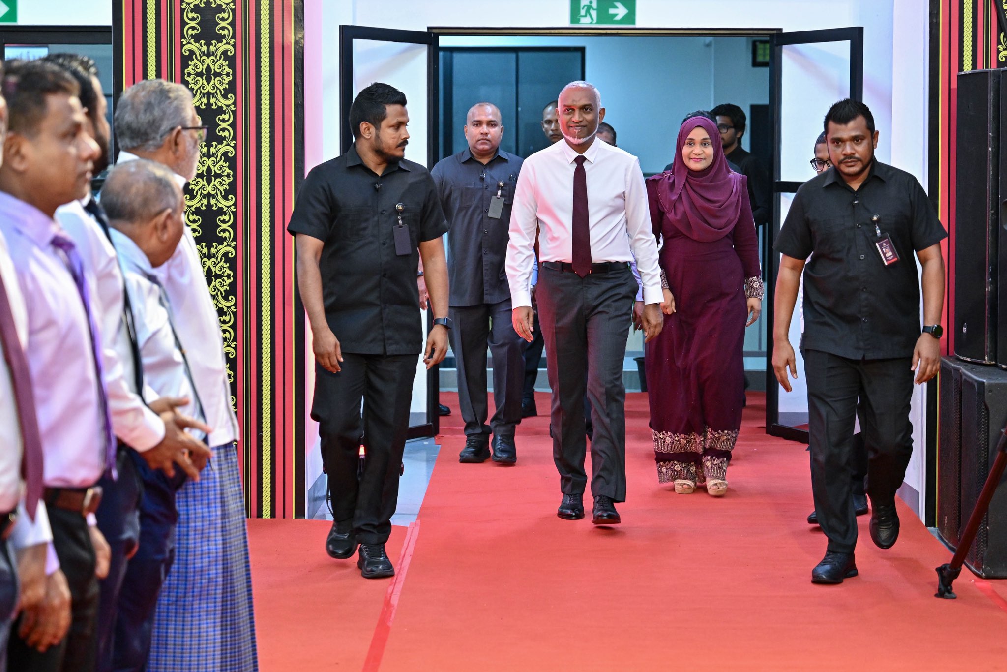 އަދަބީ މުބާރާތުގެ ނަތީޖާ ފާޅުކުރުމުގެ ރަސްމިއްޔާތަށް ރައީސުލްޖުމްހޫރިއްޔާ އާއި އެމަނިކުފާނުގެ އަނބިކަނބަލުން ޞަލާޙުއްދީން ސްކޫލަށް ވަޑައިގަންނަވަނީ. ފޮޓޯ: ރައީސް އޮފީސް
