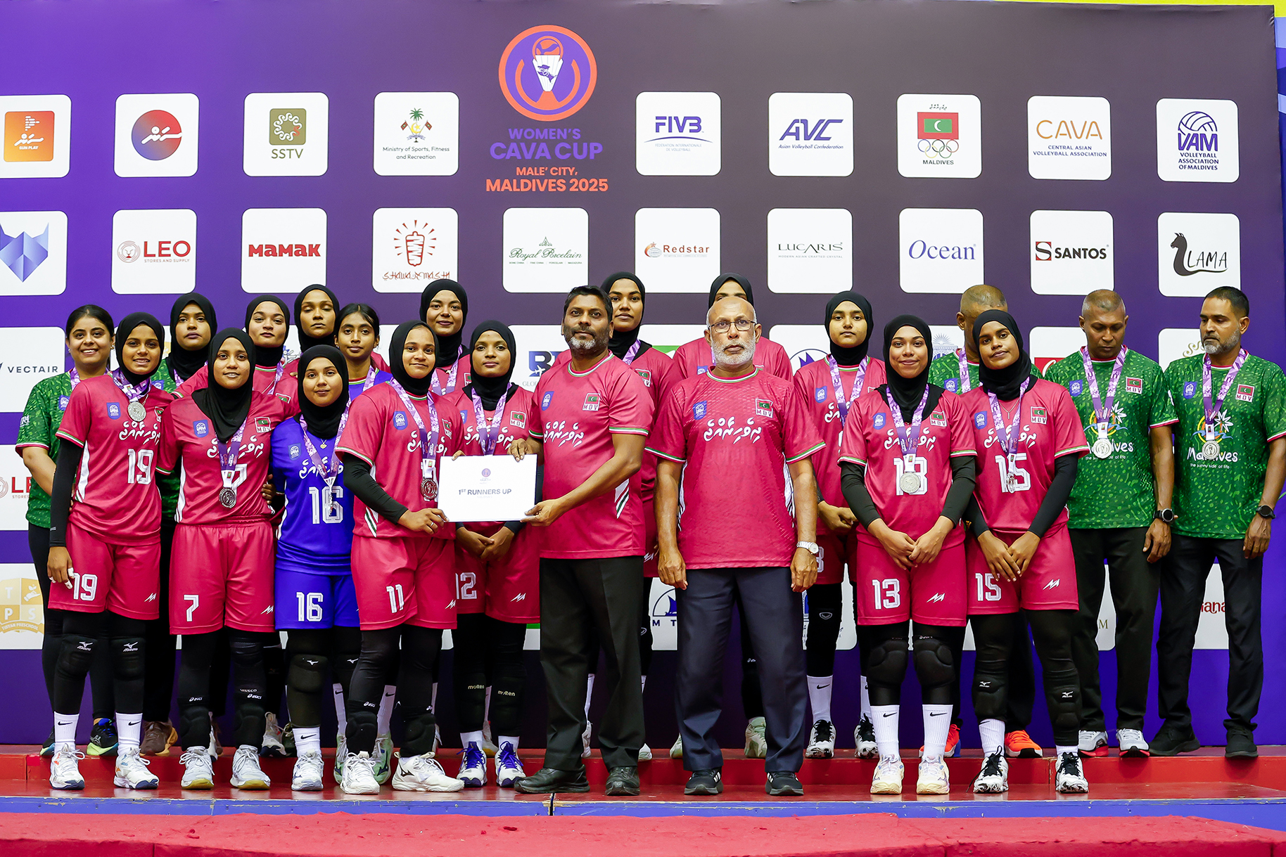 ކުޅިވަރު ވަޒީރު ޢަބްދުﷲ ރާފިޢު، ކާވާ ވިމެންސް ކަޕްގެ ރަނަރަޕް މަގާމު ހޯދި ރާއްޖޭގެ ކުޅުންތެރިންނަށް މެޑެއްޔާއި ސެޓްފިކެޓް ހަވާލުކޮށްދެއްވުން. ފޮޓޯ: ކުޅިވަރާއި ހަށިހެޔޮކަމާ ބެހޭ ވުޒާރާ