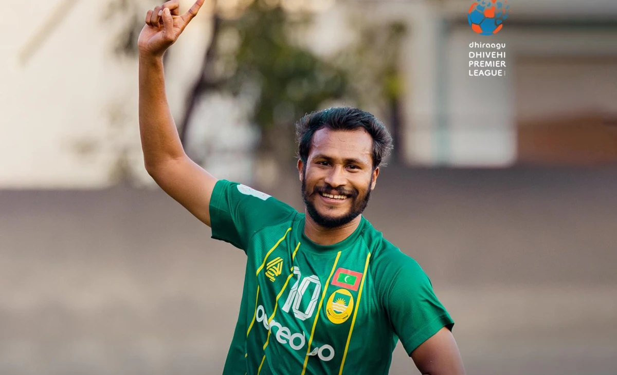 ދިރާގު ދިވެހި ޕްރިމިއާ ލީގުގައި ވިކްޓްރީ ކޮޅަށް ލަނޑުޖެހުމަށްފަހު މާޒިޔާގެ ހަމްޒާ މުޙައްމަދު އުފާ ފާޅުކުރަނީ. ފޮޓޯ: އެފްއޭއެމް