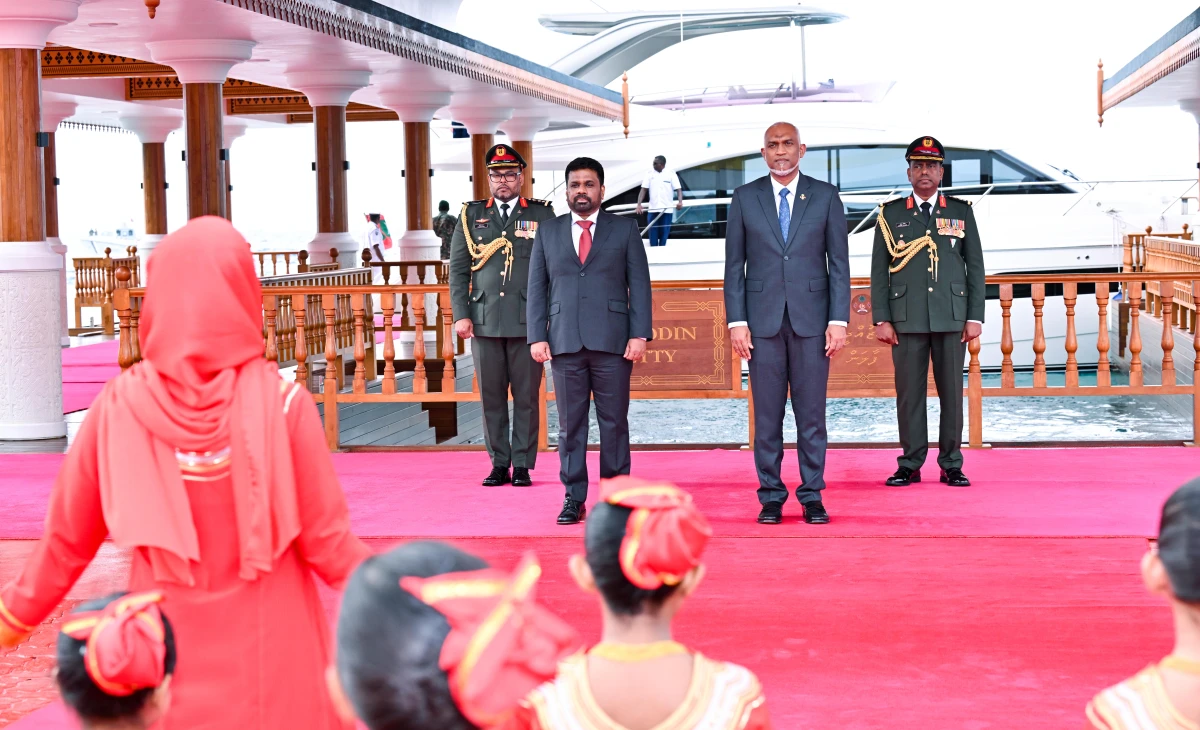 28 ޖުލައި 2025، ރައީސުލްޖުމްހޫރިއްޔާ، ސްރީލަންކާގެ ރައީސަށް ރަސްމީގޮތުން މަރުޙަބާ ދެންނެވުމަށް ބޭއްވެވި ރަސްމިއްޔާތުގެ ތެރެއިން. ފޮޓޯ: ރައީސް އޮފީސް