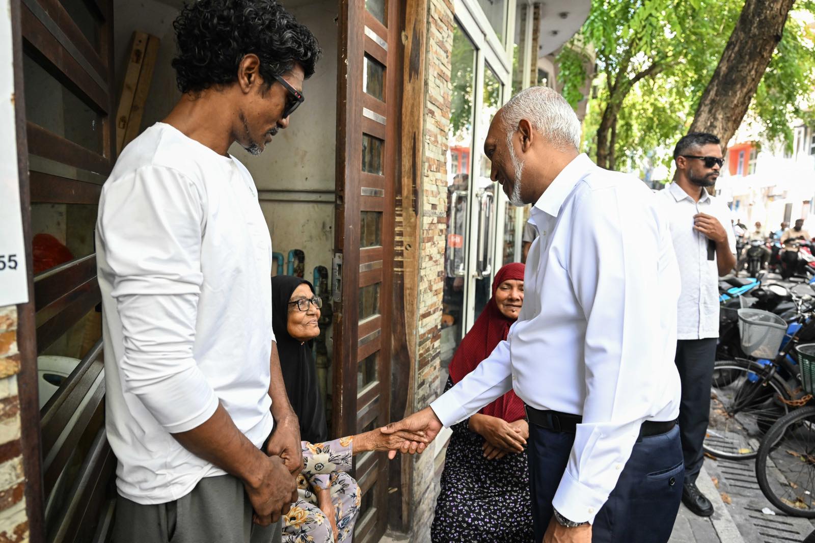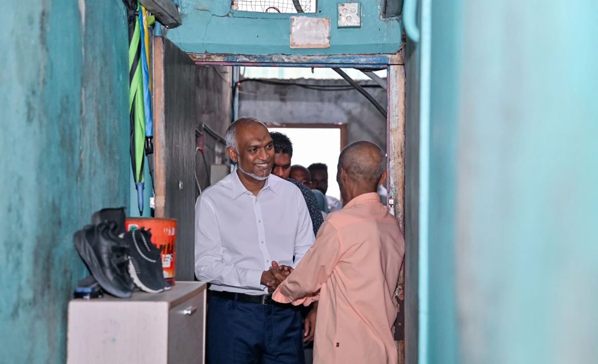 ރައީސުލްޖުމްހޫރިއްޔާ ޑރ. މުޙައްމަދު މުޢިއްޒު މެދު ހެންވޭރު ދާއިރާގެ ދޮރުން ދޮރަށް ހަރަކާތުގައި ބައިވެރިވަޑައިގަންނަވަނީ. ފޮޓޯ: ޕީއެންސީ