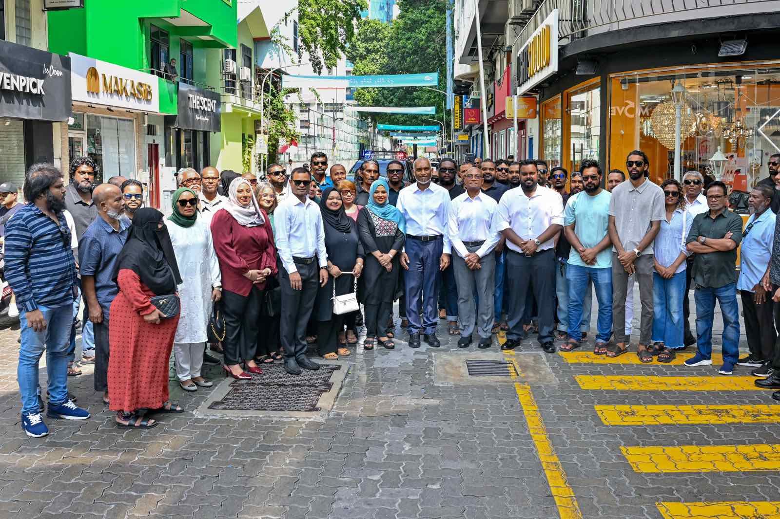 ރައީސް މެދު ހެންވޭރު ދޮރުން ދޮރަށް ހަރަކާތުގެ ބައިވެރިންނާއެކު ފޮޓޯއަކަށް ހުއްޓިވަޑައިގެންެ. ފޮޓޯ: ޕީއެންސީ