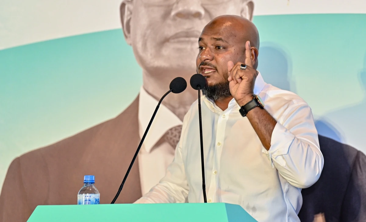ކޮންގްރެސް ޕާޓީއެއްގެ ޖަލްސާއެއްގައި މެންބަރު ޝުޖާއު ވާހަކަދައްކަވަނީ. ޤާނޫނުއަސާސީއަށް ބަދަލުތަން ގެންނާނީ އެމްޑީޕީ ރުއްސަން ނޫންކަމަށް ވިދާޅުވި. ފޮޓޯ: ޕީއެންސީ