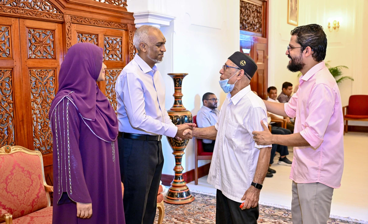 ފިޠުރު ޢީދުގެ މުނާސަބަތުގައި، ޢީދުގެ ތަހުނިޔާ ވިދާޅުވުމަށް ރައީސުލްޖުމްހޫރިއްޔާގެ ދެކަނބަލުންގެ އަރިހަށް ވަޑައިގެންނެވި ބޭފުޅުންނާ ރައީސުލްޖުމްހޫރިއްޔާ ޑޮކްޓަރ މުޙައްމަދު މުޢިއްޒާއި، އެމަނިކުފާނުގެ އަނބިކަނބަލުން ސާޖިދާ މުޙައްމަދު، ބައްދަލުކުރައްވައި، ޢީދު ސަލާން ކުރައްވައިފި.