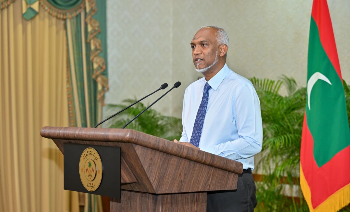ރައީސުލްޖުމްހޫރިއްޔާ ޑރ. މުހައްމަދު މުއިއްޒު. އިސްރާއީލު ބަލައިނުގަންނަކަމަށް އަދި އެއްވެސް ގައުމަކަށް މި ހަނގުރާމައިގައި ރާއްޖޭގެ ވައިގެ ސަރަހައްދު ބޭނުންކުރުމުގެ ފުރުސަތު ނުދެއްވާނެކަމަށް ވިދާޅުވި. ފޮޓޯ؛ ރައީސް އޮފީސް
