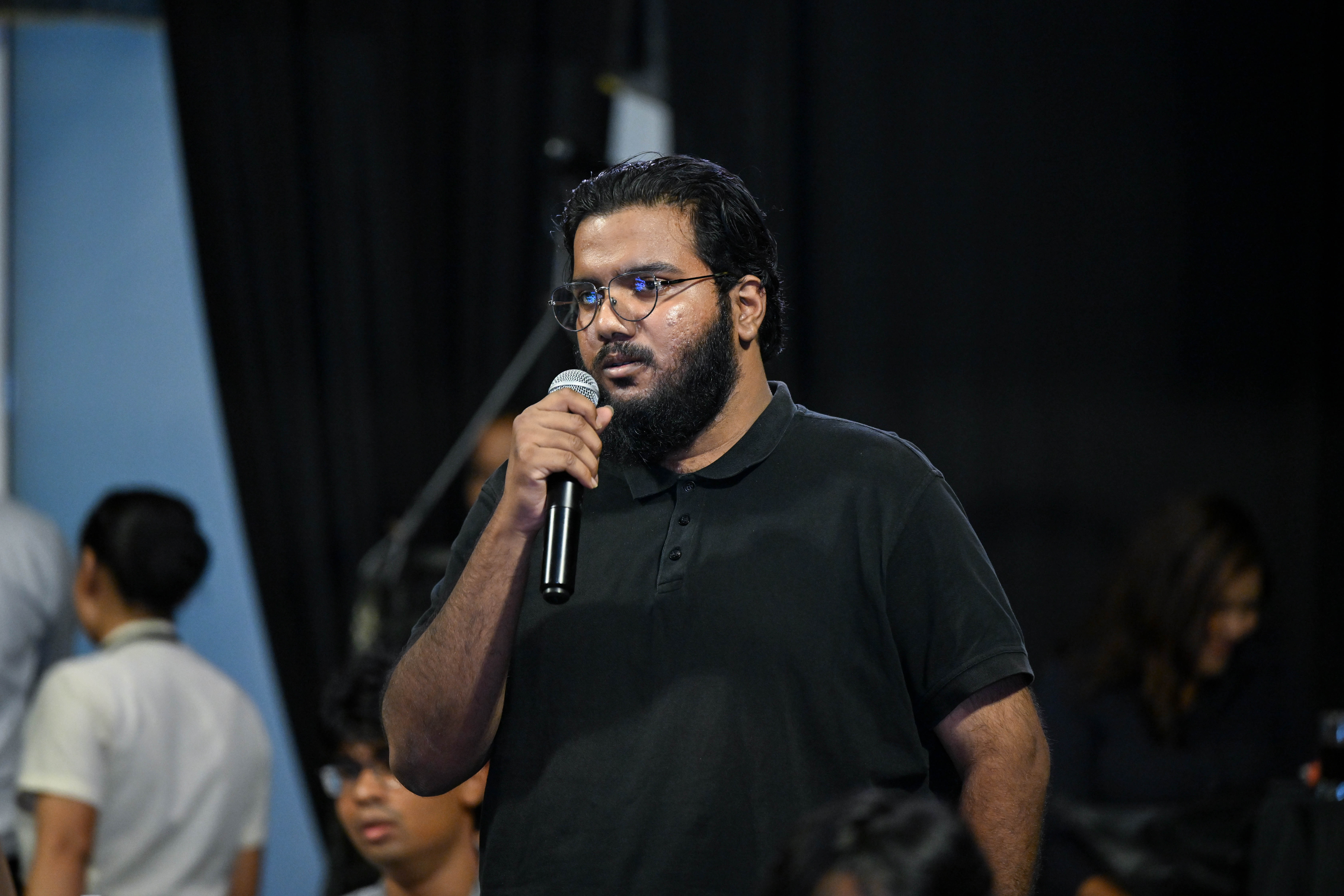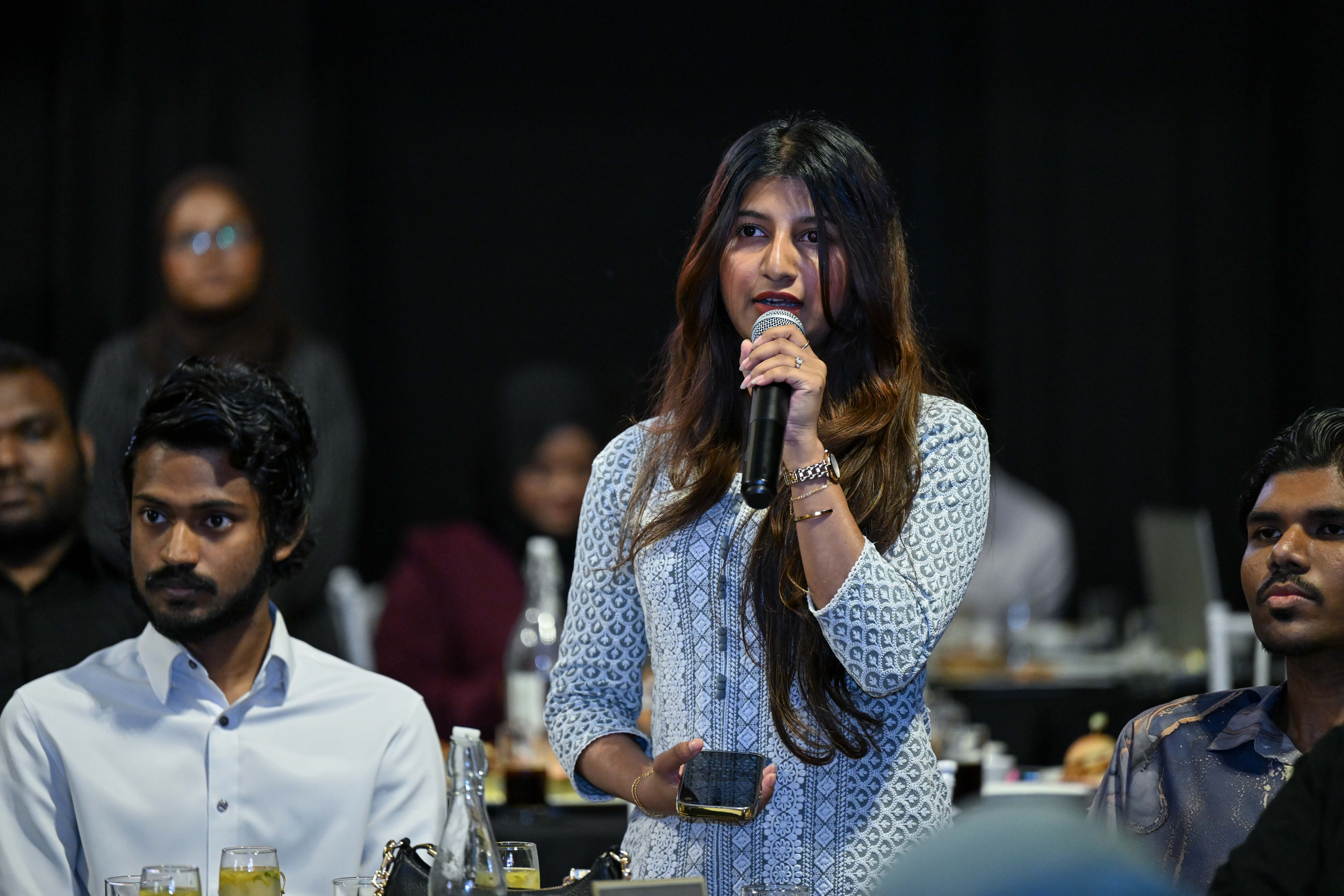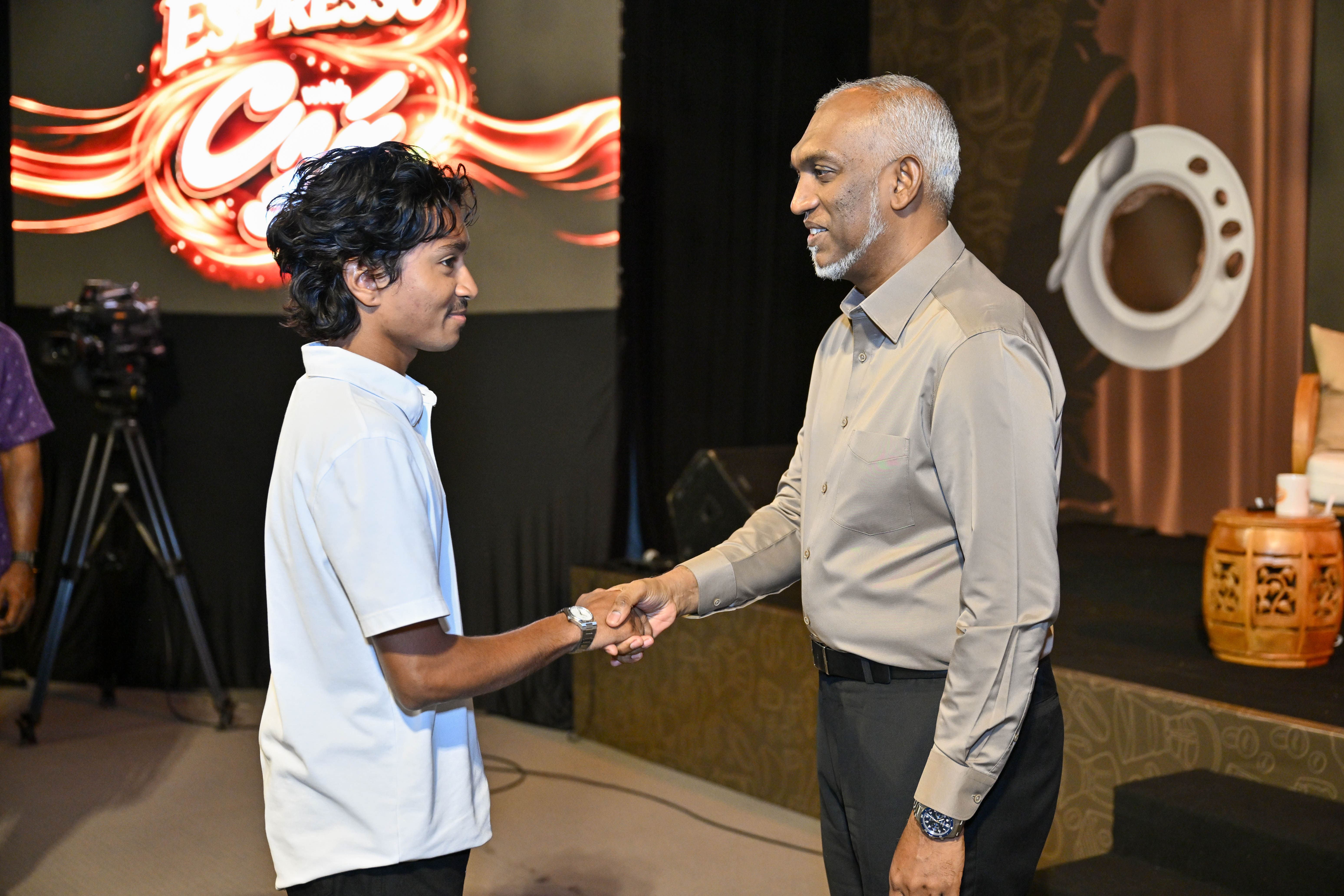 ރައީސުލްޖުމްހޫރިއްޔާ ބައިވެރިވެވަޑައިގެންނެވި "އެސްޕްރެސޯ ވިތު ކޮފީ" ހަރަކާތުގައި ޒުވާނަކު ރައީސަށް ސުވާލެއްކުރަނީ. ފޮޓޯ: ރައީސް އޮފީސް