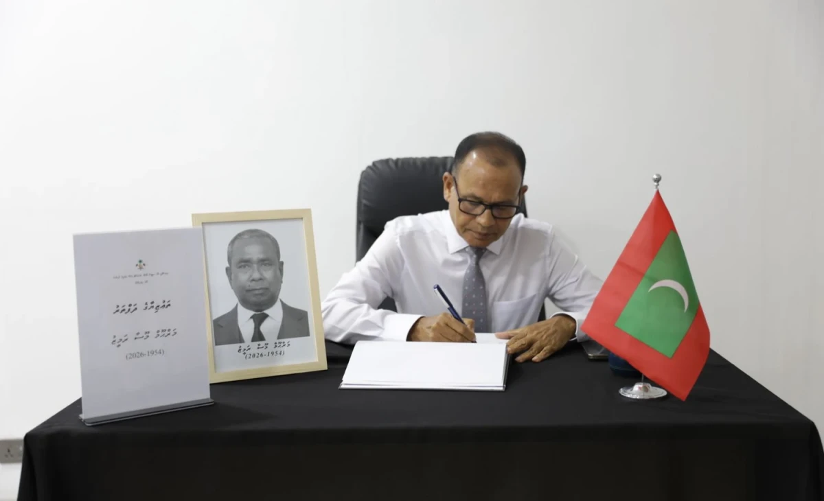 މަރުހޫމް މޫސާ ރަމީޒުގެ ތައުޒިޔާގެ ދަފްތަރުގައި މިނިސްޓަރު ސޮއިކުރައްވަނީ. ފޮޓޯ؛މިނިސްޓްރީ އޮފް ސިޓީސް ލޯކަލް ގަވަރމަންޓް އެންޑް ޕަބްލިކް ވަރކްސް