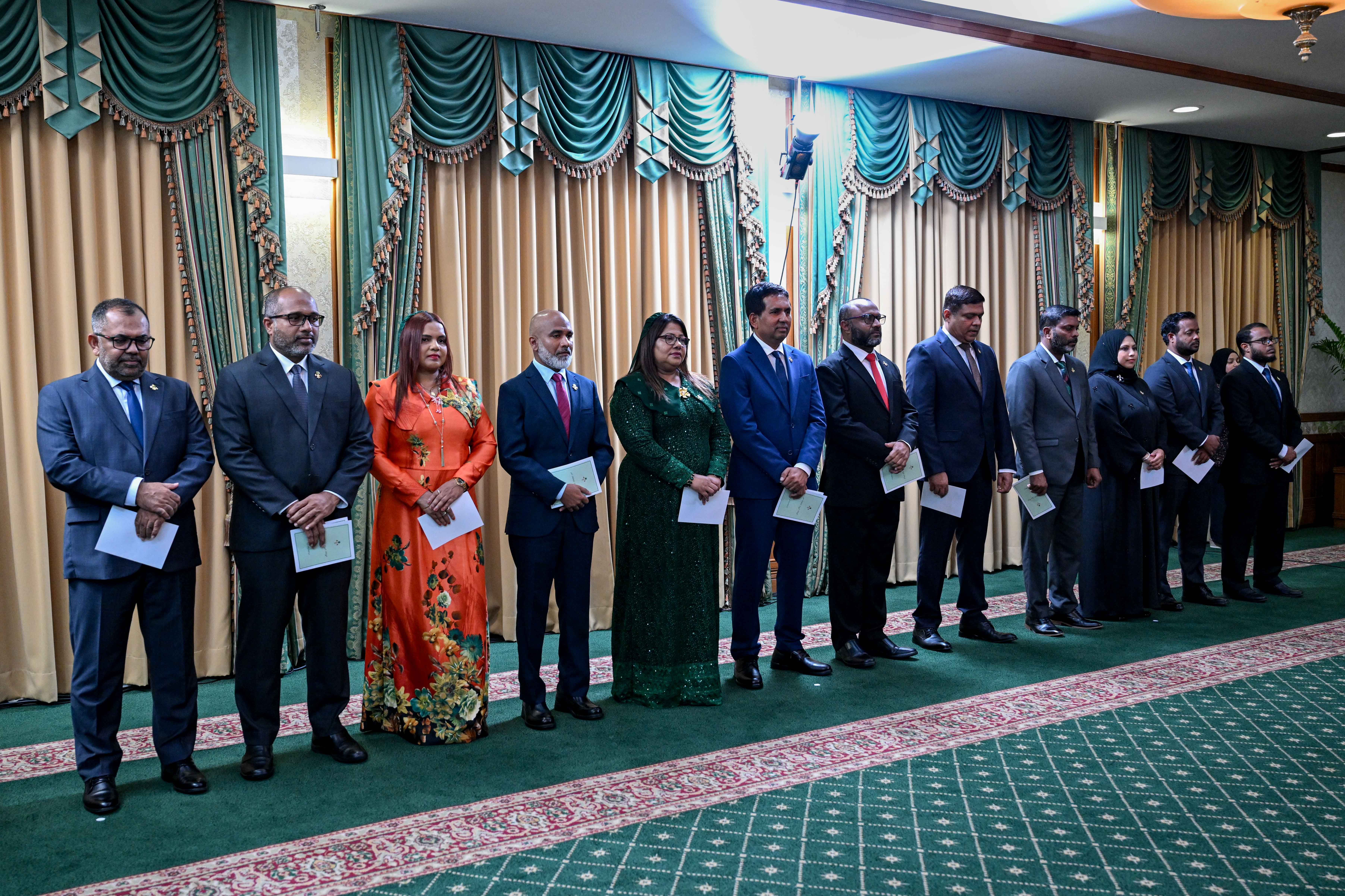ކެބިނެޓްގެ ވަޒީރުން މިރޭ ވަނީ މަޤާމުގެ އިޤްރާރުގައި ސޮއިކުރައްވާފަ އެވެ. އަދި ރައީސުލްޖުމްހޫރިއްޔާ ޑރ. މުޙައްމަދު މުޢިއްޒު ވަނީ އެ ބޭފުޅުންނަށް މަޤާމުގެ ފަތްކޮޅު ދެއްވާފަ އެވެ. މިރޭ ގެންނެވި ބޮޑު ބަދަލާއެކު ވަޒީރުންގެ އަދަދު ވަނީ 15 އަށް މަދުވެފަ އެވެ.