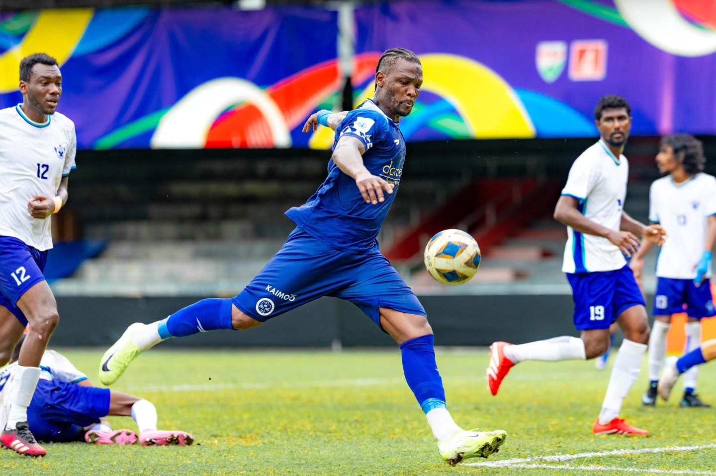 ބްލޫއާ ދެކޮޅަށް ކުޅުނު މެޗުގައި ނިއުގެ ފޯވާޑް، އަލް ހާޖީ ގޭރޯ ގޯލަށް ބޯޅަ ފޮނުވާލަނީ. ފޮޓޯ: އެފްއޭއެމް