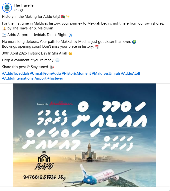 އުމްރާއަށް މީހުން ގެންގޮސްދޭ ޓްރެވަލް އެޖެންސީއެއް ކަމަށްވާ ދި ޓްރެވެލާސްއިން ބުނީ، މި ދަތުރުތައް ބޭއްވުމަށް ހަމަޖެހިފައިވަނީ ގައުމީ އެއާލައިން މޯލްޑިވިއަންއާ ގުޅިގެން އައްޑޫ އިންޓަނޭޝަނަލް އެއާޕޯޓުން ސައޫދީ އަރަބިއްޔާގެ ޖިއްދާއަށް ކަމަށެވެ.