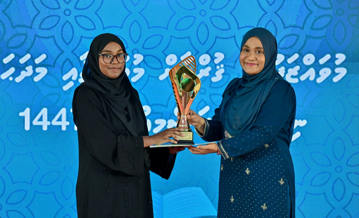 ވެމްކޯ މުވައްޒަފުންގެ ދެވަނަ ޤުރްއާން އަދި މަދަހަ މުބާރާތް 1447 ނިންމުމުގެ ރަސްމިއްޔާތު ރައީސުލްޖުމްހޫރިއްޔާގެ އަނބިކަނބަލުން ސާޖިދާ މުޙައްމަދު ޝަރަފްވެރިކޮށްދެއްވައި، ކާމިޔާބީ ލިބުނު ފަރާތްތަކަށް ޓްރޮފީ ޙަވާލުކޮށްދެއްވަނީ. ފޮޓޯ: ރައީސް އޮފީސް