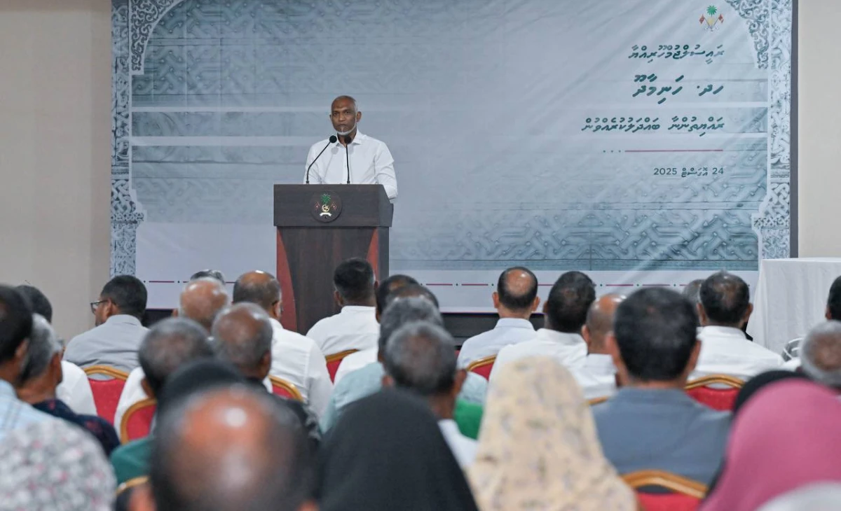 ރައީސުލްޖުމްހޫރިއްޔާ ޑރ. މުޙައްމަދު މުޢިއްޒު ހަނިމާދޫ ރައްޔިތުންނާ ބައްދަލުކުރައްވައި ވާހަކަފުޅުދައްކަވަނީ. ފޮޓޯ: ރައީސް އޮފީސް