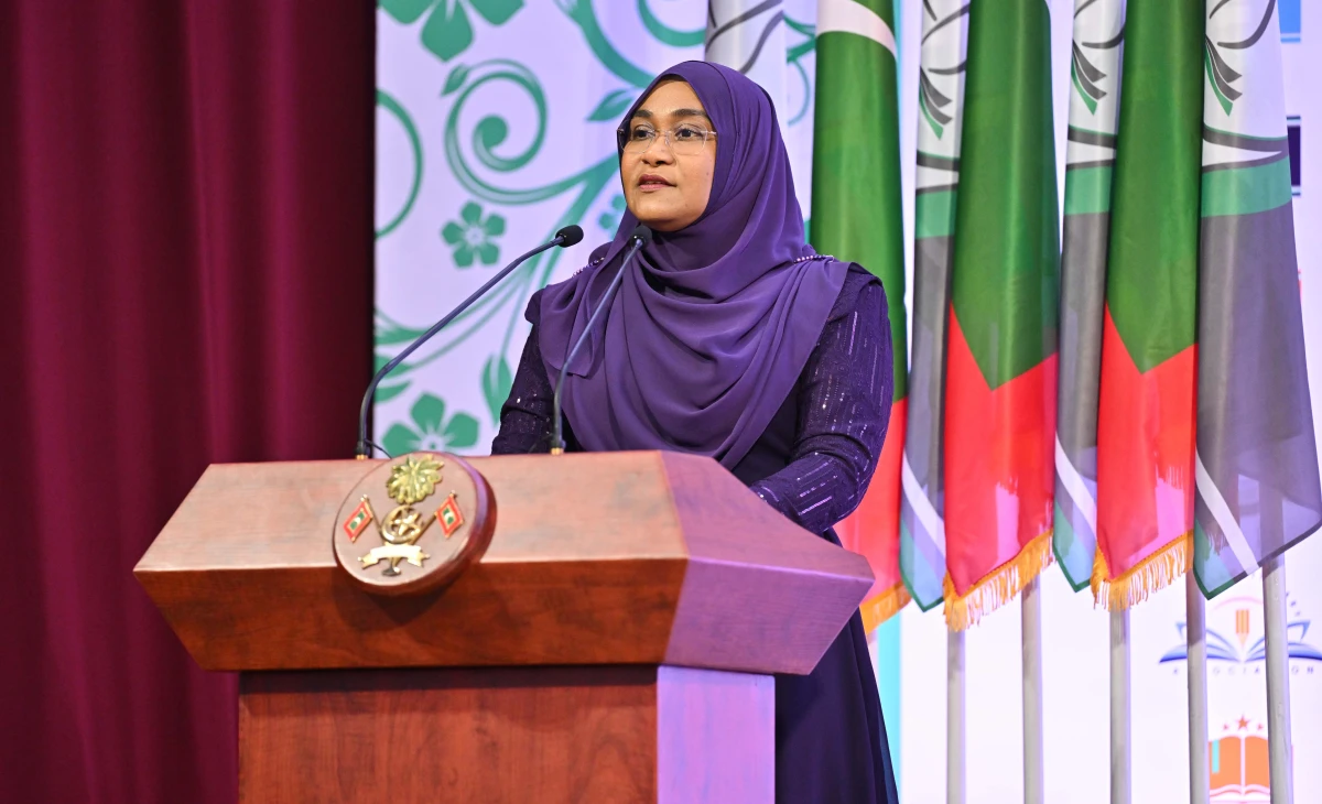ރައީސުލްޖުމްހޫރިއްޔާގެ އަނބިކަނބަލުން ސާޖިދާ މުޙައްމަދު ރަސްމިއްޔާތުގައި ވާހަކަފުޅުދައްކަވަނީ. ފޮޓޯ: ރައީސް އޮފީސް