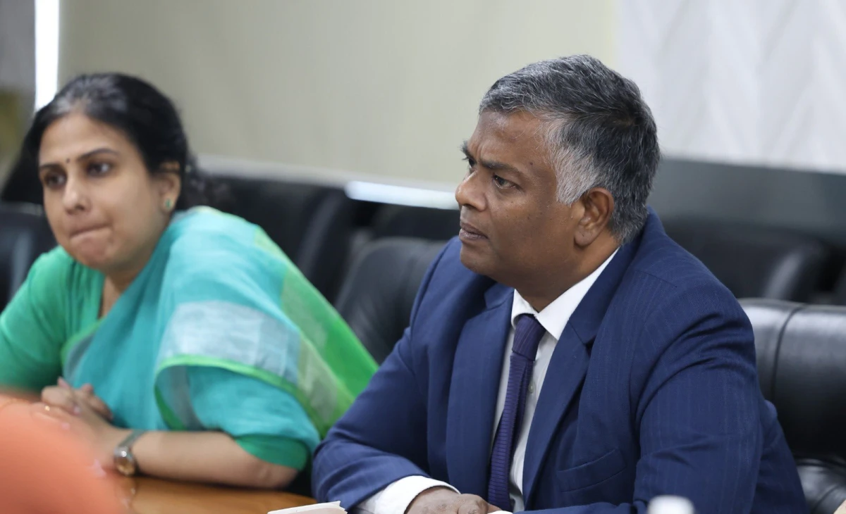 އިންޑިއާގެ ހައި ކޮމިޝަނަރު ބާލަސުބްރަމާނިއަން ބައްދަލުވުމުގައި ވާހަކަދައްކަވަނީ. ފޮޓޯ: ފިނޭންސް މިނިސްޓްރީ