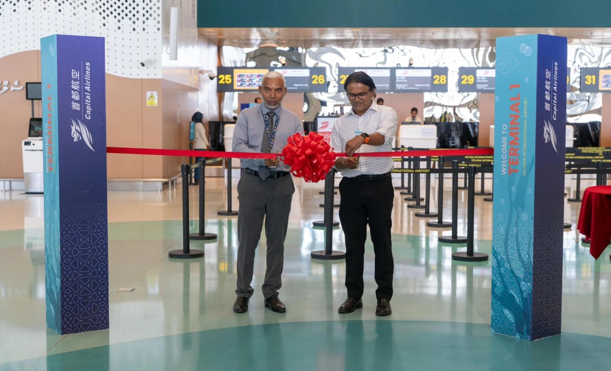 ބެއިޖިންގް ކެޕިޓަލް އެއާލައިންސްގެ ޗެކިން ކައުންޓަރުތައް ރަސްމީކޮށް ހުޅުވައި، އެ އެއާލައިނުން ފުރި 248 ފަސިންޖަރުންނަށް ވަނީ ހަދިޔާ ދީފައެވެ. އަދި ޓާމިނަލް 1 އަށް ކައިރި ކުރި ބެއިޖިންގް ކެޕިޓަލް އެއާލައިންސްގެ ފުރަތަމަ މަތިންދާބޯޓު، ޖޭޑީ455-6 އަށް ހާއްސަ ވޯޓާ ސެލިއުޓެއް އަރުވައި، އެ ފްލައިޓުން ރާއްޖެ އައި 276 ފަސިންޖަރުންނަށް ވަނީ ސަގާފީ ހަރަކާތްތަކާއެކު ހޫނު މަރުހަބާއެއް ކިޔައިފައެވެ.