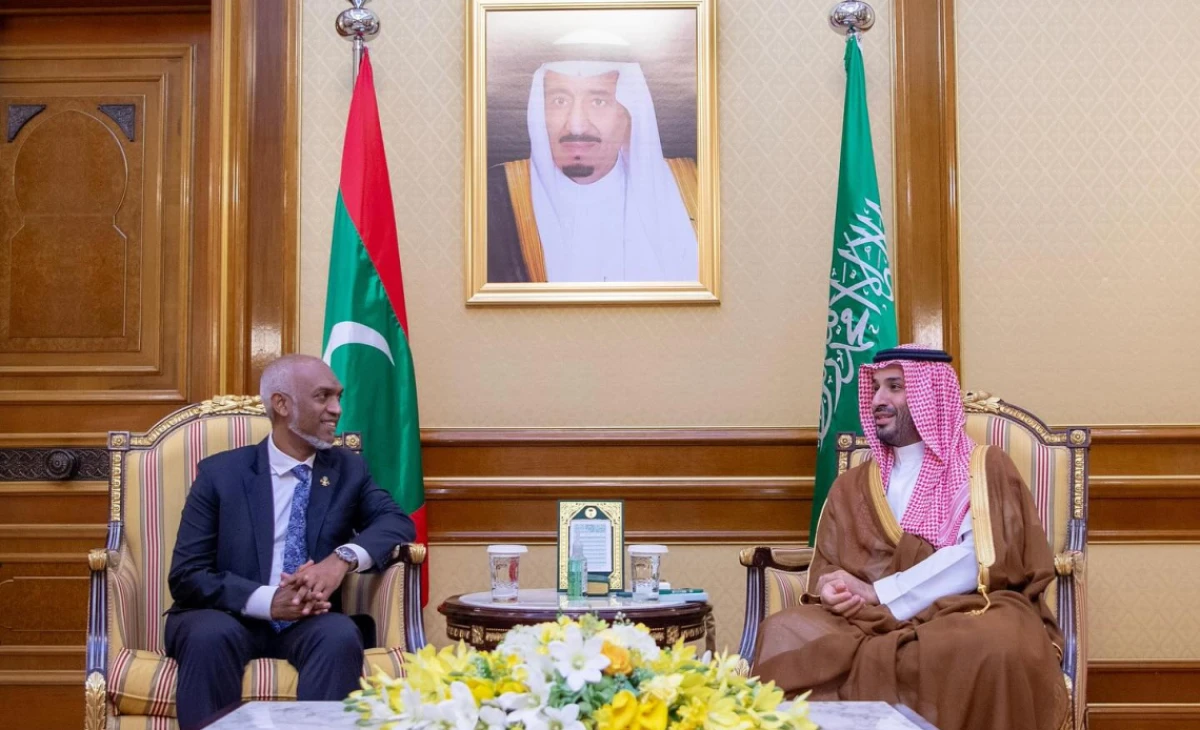 ރައީސުލްޖުމްހޫރިއްޔާ ޑރ. މުޙައްމަދު މުއިއްޒު، މިދިޔަ ޖޫން މަހު ސައުދީގެ ވަލީ އަހުދު ޕްރިންސް މުހައްމަދާ ބައްދަލުކުރެއްވުން. --ފޮޓޯ: ރައީސް އޮފީސް