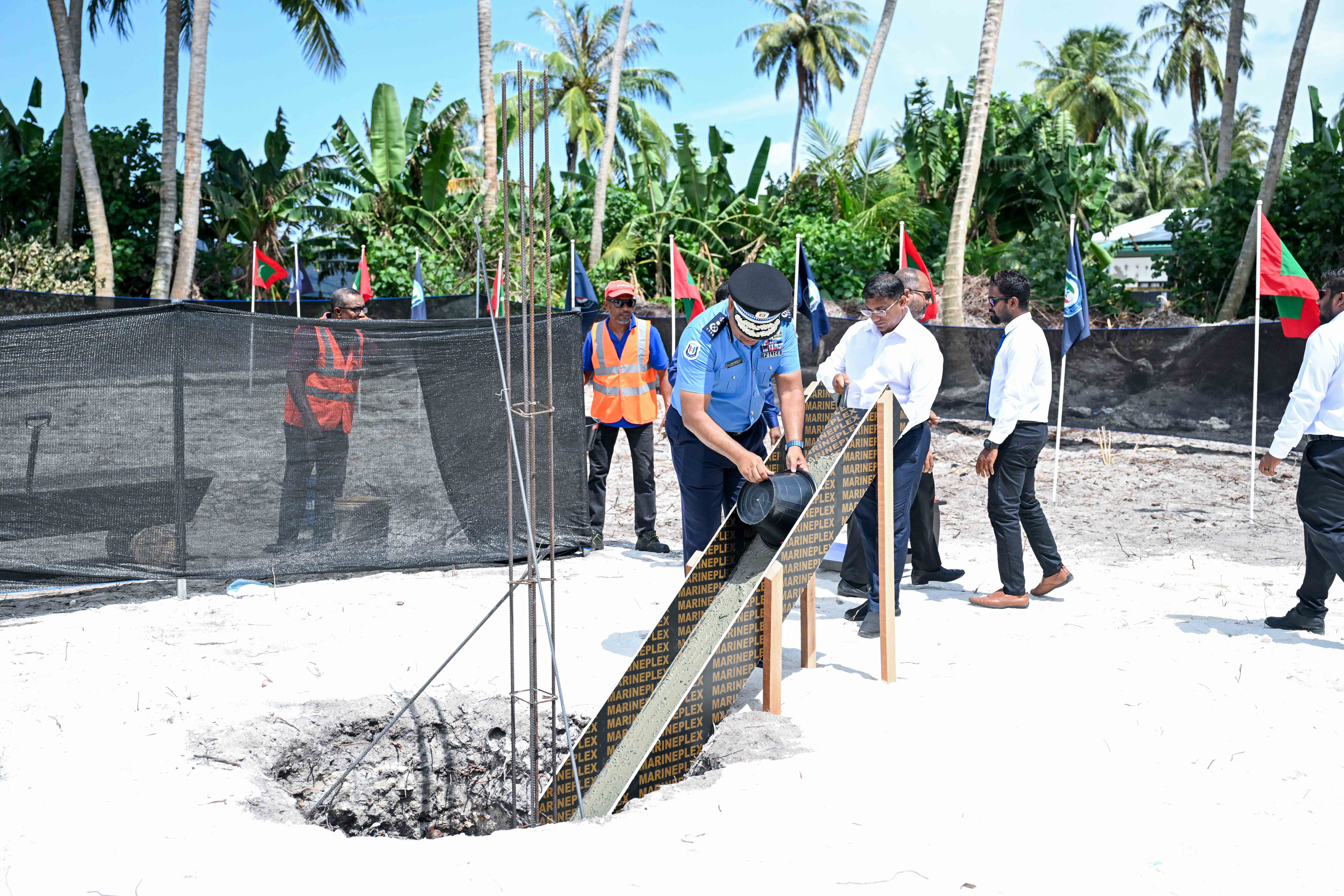 ކަނޑޫދޫގައި އަލަށް އިމާރާތްކުރާ ފުލުހުންގެ މަރުކަޒުގެ ބިންގާ އެޅުން. ފޮޓޯ: ރައީސް އޮފީސް