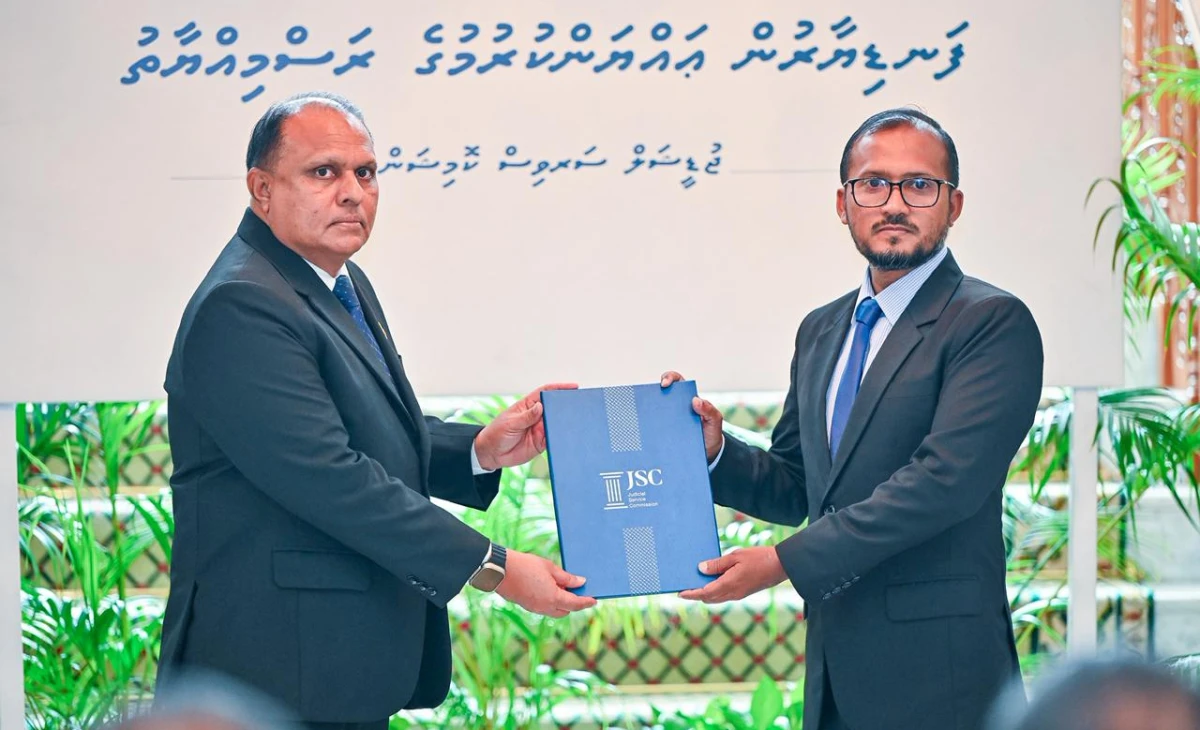 މަގާމަށް އައްޔަނު ކުރެއްވި ކަމުގެ ލިޔުން ހަވާލުކުރެއްވީ ޖޭއެސްސީގެ ރައީސް ހުސައިން ރިޒާ އެވެ.