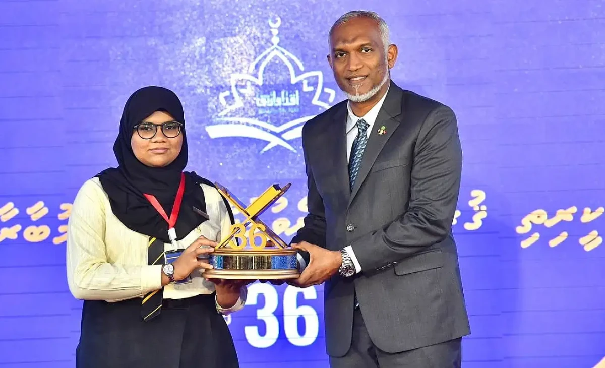 ގުރުއާން ކިޔެވުމުގެ ގައުމީ މުބާރާތުން ވަނަ ހޯދި ދަރިވަރަކަށް ރައީސް މުހައްމަދު މުއިއްޒު އިނާމު ހަވާލުކުރައްވަނީ -- ފޮޓޯ/ރައީސް އޮފީސް