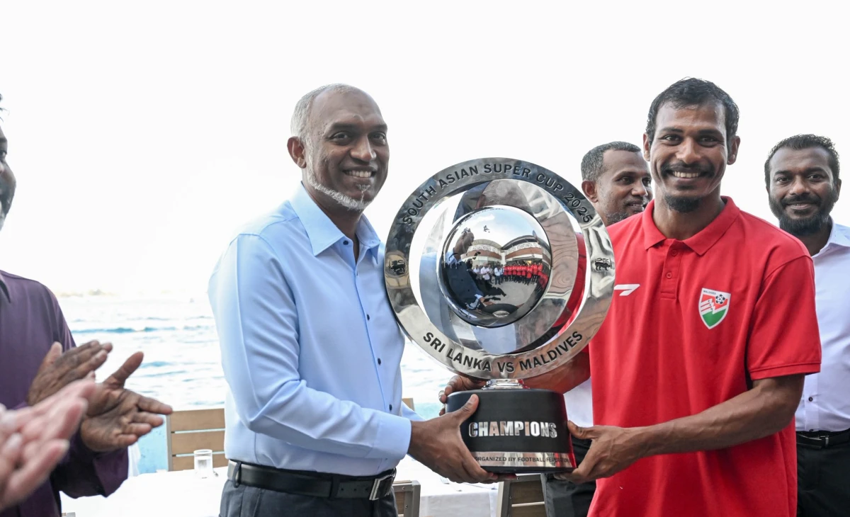 ރައީސުލްޖުމްހޫރިއްޔާ ވަނީ ރާއްޖޭގެ ޤައުމީ ފުޓްބޯޅަ ޓީމް، ސައުތު އޭޝިއަން ސުޕަރ ކަޕް 2025، ކާމިޔާބުކުރިކަން ފާހަގަކުރައްވައި ކުރިއަށްއޮތް ތަނުގައިވެސް ރާއްޖެއަށް ރީތި ނަން ހޯއްދަވައިދެއްވުމަށް އެދިވަޑައިގެންފަ އެވެ. ރައީސުލްޖުމުހޫރިއްޔާ ވަނީ، ޤައުމީ ޓީމު ކުރަމުން އަންނަ މަސައްކަތަށް ހިތްވަރު ދެއްވައި، އަބަދުވެސް ޤައުމީ ޓީމަށް ކާމިޔާބީއަށް އެދިވަޑައިގެންފަ އެވެ.