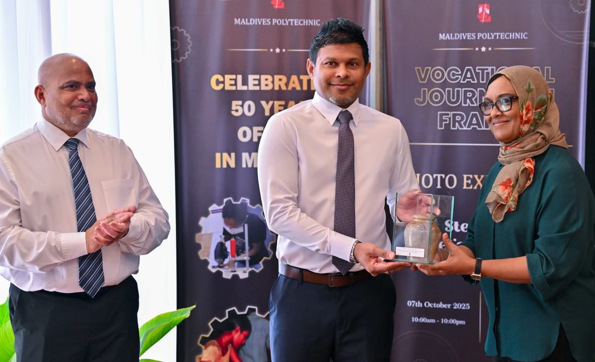 ދިވެހި ރާއްޖޭގައި ޓެކްނިކަލް އަދި ވޮކޭޝަނަލް އެޑިއުކޭޝަން އެންޑް ޓްރެއިނިންގް (ޓީވެޓް) ގެ ޚިދުމަތް ދޭތާ 50 އަހަރު ފުރޭ މުނާސަބުގައި، މޯލްޑިވްސް ޕޮލިޓެކްނީކްއިން ކުރިއަށްގެންދާ ފޮޓޯ މައުރަޒު "ވޮކޭޝަނަލް ޖަރނީ އިން ފްރޭމްސް" ރައީސުލްޖުމްހޫރިއްޔާގެ ނައިބު، ޙުސައިން މުޙައްމަދު ލަޠީފު، ރަސްމީކޮށް ހުޅުއްވައިދެއްވައިފިއެވެ.