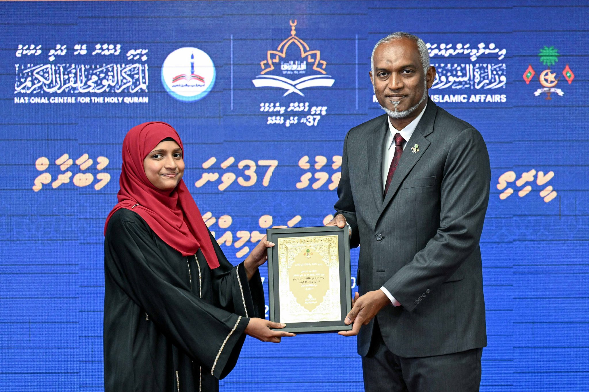 ކީރިތި ޤުރްއާން ކިޔެވުމުގެ 37 ވަނަ ޤައުމީ މުބާރާތް ނިންމުމަށް، އިސްލާމީ މަރުކަޒުގެ ޖަލްސާކުރާ މާލަމުގައި މިއަދު ހެނދުނު ކުރިއަށްދިޔަ ރަސްމިއްޔާތުގައި ރައީސުލްޖުމްހޫރިއްޔާގެ އަނބިކަނބަލުން ސާޖިދާ މުޙައްމަދުއާއި، ރައީސުލްޖުމްހޫރިއްޔާގެ ނައިބު، އަލްއުސްތާޛު ޙުސައިން މުޙައްމަދު ލަޠީފްއާއި، ވަޒީރުންގެ މަޖިލީހުގެ މެންބަރުންބައިވެރިވެވަޑައިގެން، މުބާރާތުގެ އެކި ވަނަތައް ހާސިލުކުރެއްވި ބައިވެރިންނަށް އިނާމާއި ހަނދާނީ ލިޔުމާއި ފިލާ ބައްސަވައިދެއްވިއެވެ.
