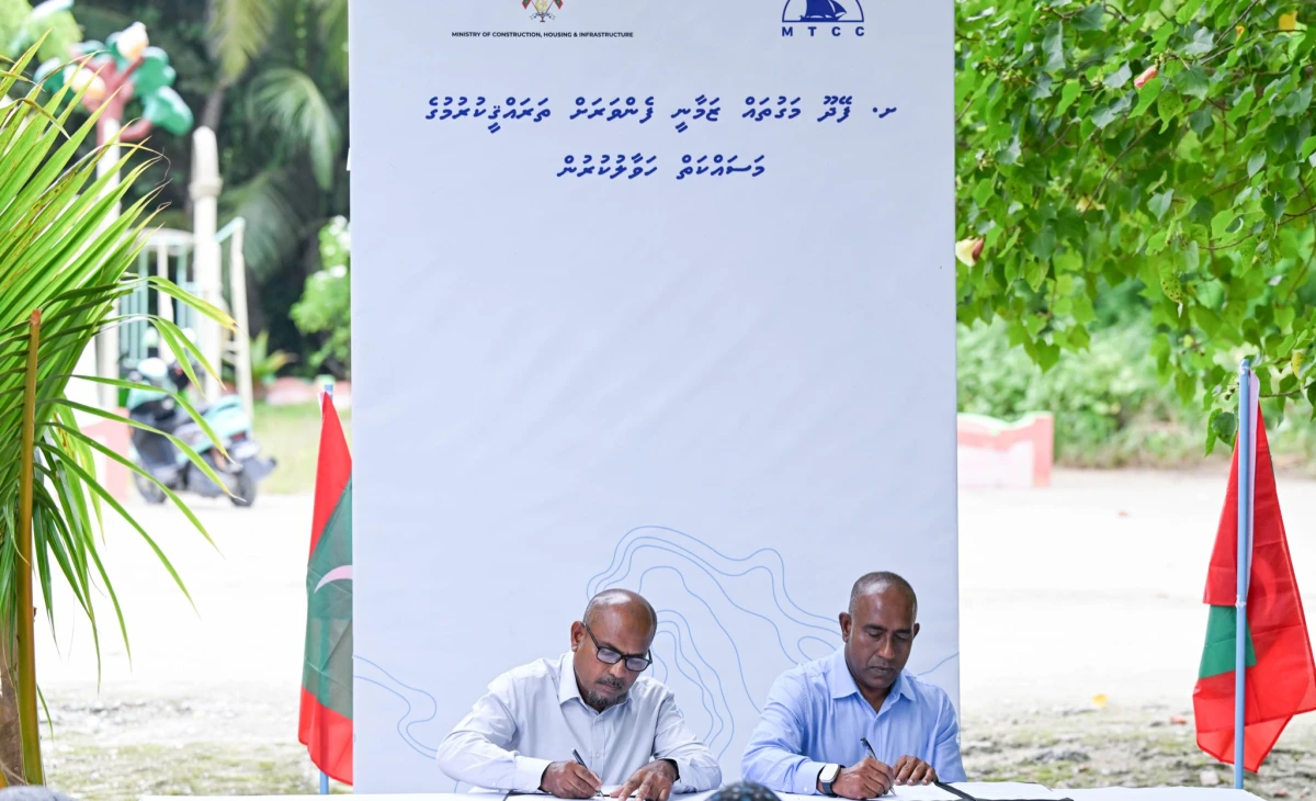ރައީސުލްޖުމްހޫރިއްޔާ ޑޮކްޓަރ މުޙައްމަދު މުޢިއްޒު ށ. އަތޮޅަށް މިހާރު ކުރައްވާ ދަތުރުފުޅުގައި ފޭދޫގައި ބޭއްވި ރަސްމިއްޔާތުގައި މިނިސްޓްރީ އޮފް ކޮންސްޓްރަކްޝަން، ހައުސިންގ އެންޑް އިންފްރާސްޓްރަކްޗަރގެ ފަރާތުން ސޮއިކުރެއްވީ މިނިސްޓަރ އޮފް ސްޓޭޓް ޙަސަން ރަޝީދުއެވެ. އަދި އެމްޓީސީސީގެ ފަރާތުން ސޮއިކުރެއްވީ މެނޭޖިންގ ޑިރެކްޓަރ ޑީސީޕީ (ރިޓަޔާރޑް) އަހްމަދު ސައުދީއެވެ.