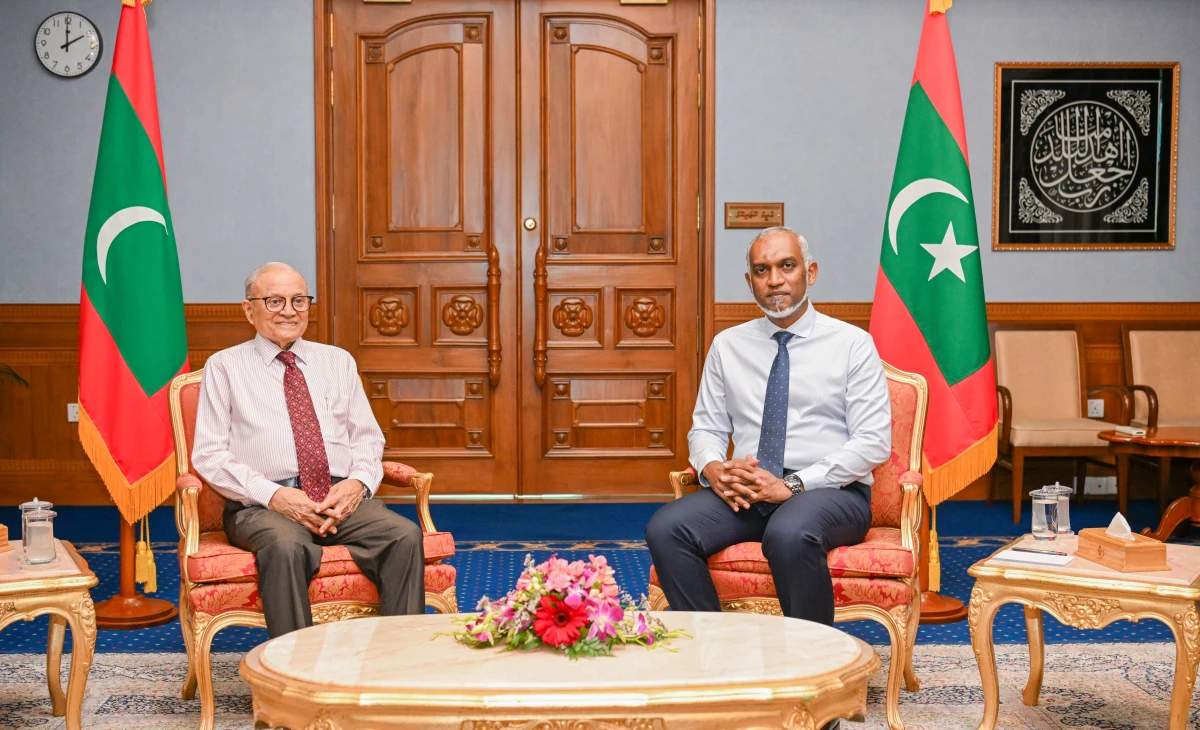 ރައީސުލްޖުމްހޫރިއްޔާ ޑރ. މުޙައްމަދު މުޢިއްޒު، ޑިސެމްބަރު 2023 ގައި ކުރީގެ ރައީސް މައުމޫނާ ބައްދަލުކުރައްވަނީ. ފޮޓޯ: ރައީސް އޮފީސް
