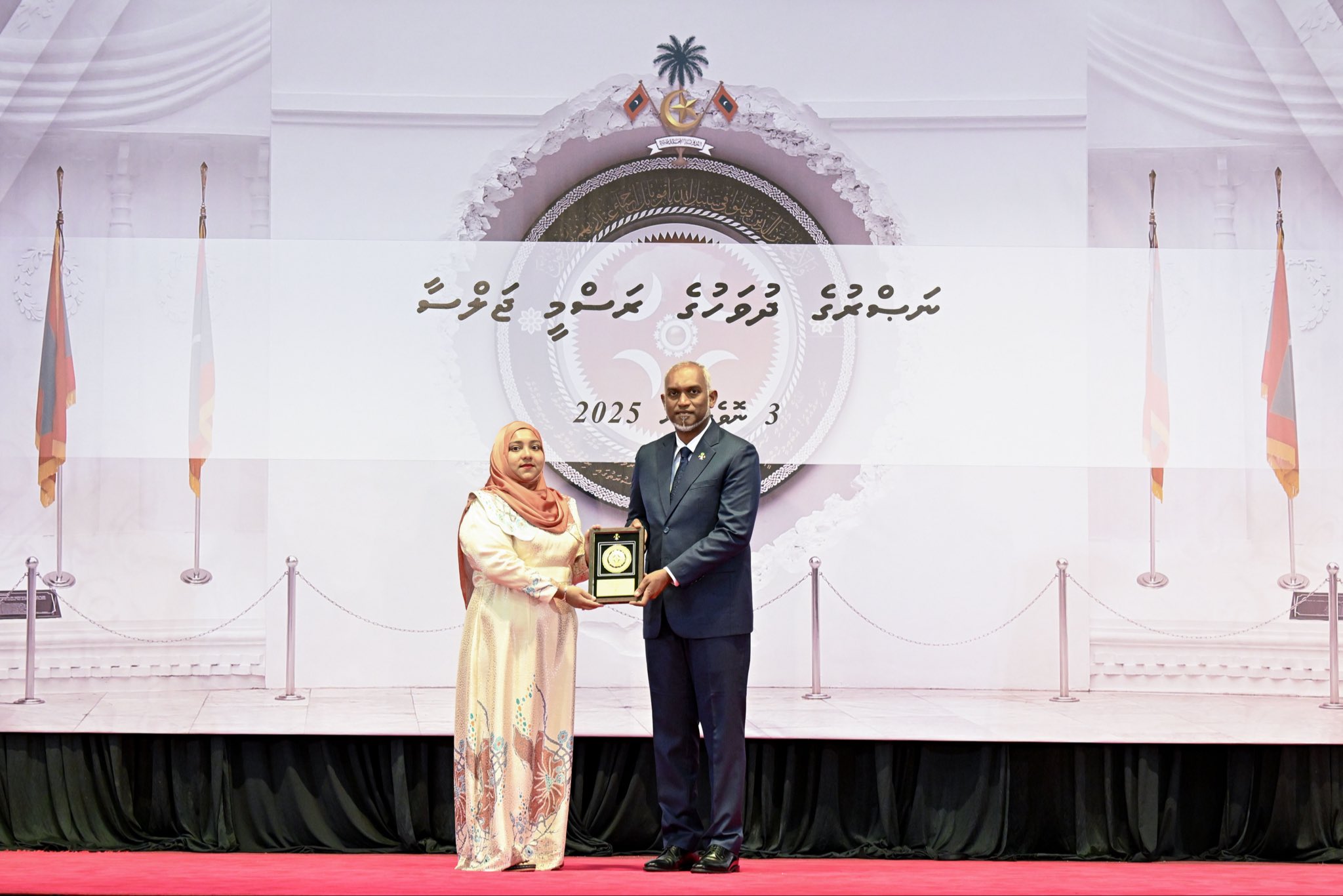 ނަޞްރުގެ ދުވަހުގެ ރަސްމީ ޖަލްސާއަށް ރައީސުލްޖުމްހޫރިއްޔާ އަދި ސިފައިންގެ އެންމެ މަތީވެރިޔާ ޑޮކްޓަރ މުޙައްމަދު މުޢިއްޒުއާއި އެމަނިކުފާނުގެ އަނބިކަނބަލުން ސާޖިދާ މުޙައްމަދު ވަޑައިގަތުމުން އެދެކަނބަލުންނަށް، މަރުޙަބާ ދެންނެވީ، މިނިސްޓަރ އޮފް ޑިފެންސް މުޙައްމަދު ޣައްސާން މައުމޫނެވެ.